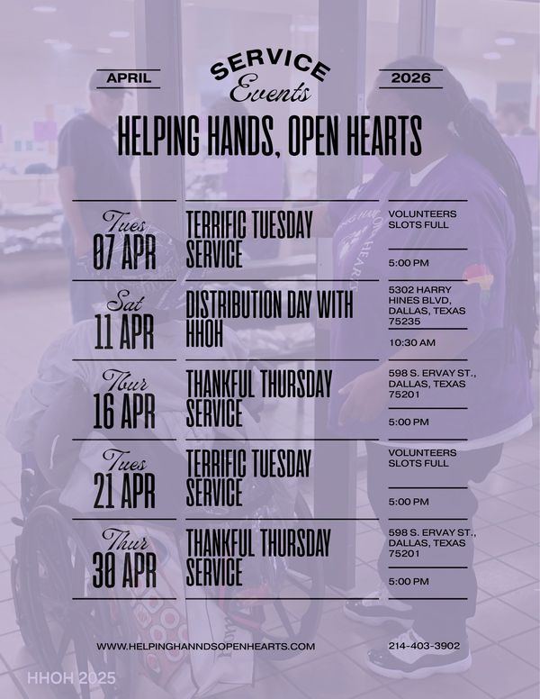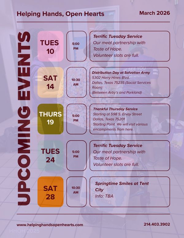 Join us for our monthly event at the Salvation Army. Our volunteers serve the second Saturday of every month. Salvation Army - Social Services Room 5302 Harry Hines Blvd Dallas, Texas 75235, 10:30 AM to 1:30 PM.