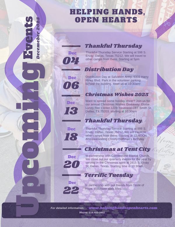 Our quarterly events in Tent City are held in March, June, September, & December. Our favorite month is September as it's Roz's Birthday Bash! We love celebrating the day with our friends in Tent City. Tent City 2815 S. Ervay Dallas, Texas 75215 10:30 AM to 1:30 PM.