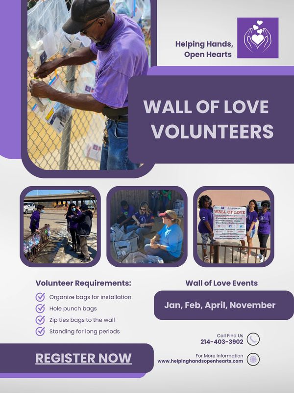 The wall of love is one of our favorite times of year. We place blessing bags out for our friends, which include snacks, water, hygiene items, clothing, and toiletries. Wall of Love is located at 1819 MLK Blvd Dallas, Texas 75215.